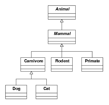 1You can find many different definitions of what makes a system object-oriented, but you would have trouble finding two OO developers who would agree to any one definition. We will use this definition of object-orientation.4Note the names Animal and Mammal are shown in italics in the UML diagram. UML uses italics to designate abstract classes.
