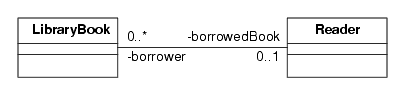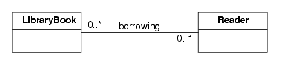 Associations also can have a multiplicity attribute. In the borrowing example, note the 0..* and 0..1 values right next to each class diagram. The 0..* by the LibraryBook diagram means that a Reader can borrow an unlimited number of books, from 0 up to an unspecified number. The 0..1 by the Reader diagram means that a given book will be borrowed by at most one reader. The multiplicity values can specify explicit values if needed (for example, 0..4 would mean a Reader could borrow at most 4 books). If a multiplicity is not specified, 1 is assumed.