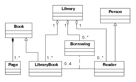 This example has two generalized superclasses, Book and Person. Each of these describes generic objects. Presumably, each would contain attributes common to all Books and all Persons, such as a name. Note that a Book is composed of Pages. The composition relationship shown indicates that a Book will have from one to any number of pages. Any methods a Book requires to manipulate Pages would be implemented in the Book class, and would be available for subclasses of Book. A LibraryBook is derived from Book, and is a specialized kind of Book. It might have additional attributes such as an acquisition date, borrowing status, and an identification number.