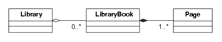 Figure 2-6 shows an aggregation relationship between a Library and LibraryBooks. One might think that a library is not a library without any books, and that the relationship should be a composition. Perhaps. But one of the differences between aggregation and composition is that when an object is destroyed, so are all of its components, while the parts of an aggregation remain. So, if you destroy a Book, the Pages are gone, too. On the other hand, if you close a Library, all the Books will still exist.