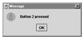 We will define a simple Java application that displays two buttons (Figure 5-4), and responds to the user click by displaying an appropriate dialog box (Figure 5-5). However, this example can be extended to much more complicated user interfaces. We will implement this application three different ways - the single listener approach, the anonymous inner class approach, and the named inner class approach.