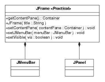 ... // Setup a JFrame for practical use JFrame theFrame = new JFrame("Application Name"); JMenuBar theMenuBar = new JMenuBar(); // code to define items on Menu, event handlers, etc. ... theFrame.setJMenuBar(theMenuBar); JPanel thePanel = new JPanel(); // code to define what is on panel, layout manager, // define user interface, command control, etc. // (non-trivial) ... theFrame.setContentPane(thePanel); theFrame.pack(); theFrame.setVisible(true); ...This code fragment would be found in the definition of some object. This would usually be defined in the top-level class that has the main method, and defines the application. It is likely that all this code would be found in the order shown here, but would have some code in between the steps to use the parts of the interface. But the steps shown are really at the heart of the matter: