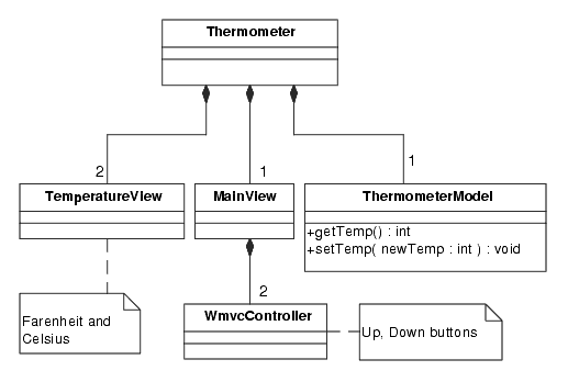 Figure 5-12 is the UML diagram of the Thermometer application. Note that this diagram is really somewhat simplified to show the logical structure of the app. We don't show the WmvcApp, WmvcModel, or WmvcView classes as they are unneeded detail. The update, modify, and draw-in associations have been removed to simplify the diagram.