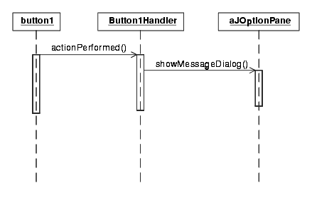 /* * Simple3.java - an example of handling events. * For this example, we will use inner member classes to * implement an ActionListener for each button. This approach * can avoid some of the code clutter that anonymous classes * can sometimes cause. It also concentrates the action code * all in one place, and allows synonyms. */ import java.awt.*; import java.awt.event.*; import javax.swing.*; public class Simple3 extends JPanel { private static JFrame frame; // static so main can use it private static JPanel myPanel; // a panel for contentPane private JButton button1; // Define out here to make private JButton button2; // visible to ActionListener // Define handlers for each event needed (button1, button2) private class Button1Handler implements ActionListener { public void actionPerformed(ActionEvent e) { JOptionPane.showMessageDialog(frame, "Button 1 pressed"); } } private class Button2Handler implements ActionListener { public void actionPerformed(ActionEvent e) { JOptionPane.showMessageDialog(frame, "Button 2 pressed"); } } public Simple3() // Construct, build GUI { // Create a panel myPanel = new JPanel(); // Create the buttons button1 = new JButton("Button 1"); button2 = new JButton("Button 2"); // For each component add it ActionListener class button1.addActionListener(new Button1Handler()); button2.addActionListener(new Button2Handler()); myPanel.add(button1); // Adds to current JFrame myPanel.add(button2); } public static void main(String s[]) { Simple3 gui = new Simple3(); // Simple3 component frame = new JFrame("Simple3"); // JFrame for the panel // Standard idiom to catch close event frame.addWindowListener(new WindowAdapter() { public void windowClosing(WindowEvent e) {System.exit(0);} }); frame.getContentPane().add(myPanel); frame.pack(); // Ready to go frame.setVisible(true); } }The sequence diagram in Figure 5-8 now shows that the named listener Button1Handler is used when a user clicks Button1.