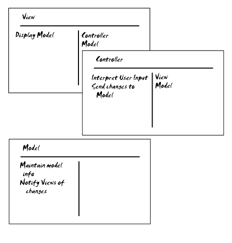 In practice, especially in Java, the View and Controllers are often combined. This is usually due to the design of the GUI toolkit, such as Swing. So a Java MVC program will really be a Model and associated View/Controllers made up of specifications of Swing components and their listeners.