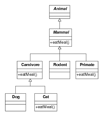 Polymorphism means a Cat uses its own eatMeal, a Dog uses the Carnivore eatMeal, and a Rodent the Mammal eatMeal.The figure shows an Animal hierarchy. Since all mammals need to eat, there would likely be a general method defined by the Mammal class to handle eating, called eatMeal, for example. While all Mammal objects might share some eating behaviors that are defined in the general Mammal eatMeal method, some would require some specialized eating behaviors that are different than other Mammal objects. The eating habits of a Dog are different than a Cat, which are different than a Rodent, which are different than a Primate. Thus, each subclass definition can include an eatMeal method that implements the specialized eating for that subclass. Not all subclasses need implement a specialized method if the superclass method is satisfactory. In figure, the Dog uses the more general Carnivore eatMeal, while the Cat has its own specialized eatMeal. The Rodent uses the general Mammal eatMeal. Since all animals may not need an eatMeal, there is no eatMeal method defined by the Animal class. Note that all these methods have the same name, eatMeal, even though they implement different behaviors.