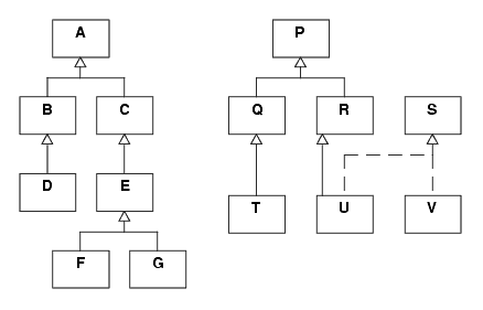 Some relationships shown by this "class forest" include: A and P are root classes. P is a superclass of Q, R, T, and U. A, C, and E are all superclasses of F and G. B is a subclass of A, and D is a subclass of B. B and C are both derived from the common superclass A, using single inheritance. U is derived from R and implements the interface S. D, F, G, T, U, and V will certainly be concrete classes since they are at the bottom of the hierarchy. Higher level classes could be either abstract or concrete. Note that in Java, A and P would be derived (probably implicitly) from the Java Object class.Visibility of Methods