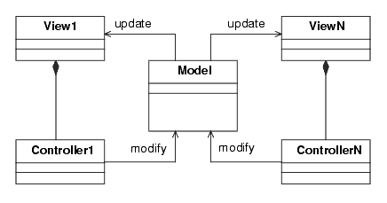 This is an elegant architecture, and is shown in Figure 5-9. Note that there can be as many views as needed. Logically, each view has an associated controller. Typically there will be a single Model class, and several View classes with their associated Controller classes. The Controller will respond to actions from the user, use whatever information it needs from the associated View, and send a message to the Model to modify itself. When a Model changes (and this can be caused by events other than user commands, such as asynchronous events generated by a shared database being modified), it notifies all Views, which then update the display.