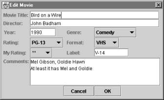 Toolkits that supports these components usually provide the capability to layout and group controls within a dialog or other display frame. The dialog in Figure 5-2 is from the MovieCat application. It uses label, text input, combo box, and button controls.