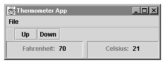 /* * MainView - Top level view/controller for the Thermometer * * This is the main view/controller. * Copyright (c) 2001, Bruce E. Wampler */ import java.util.*; import java.awt.*; import java.awt.event.*; import javax.swing.*; public class MainView extends WmvcView { private ThermometerModel myModel; // local model reference public MainView() { myModel = (ThermometerModel) WmvcApp.getModel(); myModel.addView(this); JMenu fileMenu = new JMenu("File"); // File->Up WmvcMenuItemCtl fileUp = new WmvcMenuItemCtl(fileMenu, "Up",null, 'U', null /* no accel */, new WmvcExecutor() { public void execute(ActionEvent event) { myModel.setTemp(myModel.getTemp()+1); } }); // File->Down WmvcMenuItemCtl fileDown = new WmvcMenuItemCtl(fileMenu, "Down",null, 'D', null /* no accel */, new WmvcExecutor() { public void execute(ActionEvent event) { myModel.setTemp(myModel.getTemp()-1); } }); // File->Exit WmvcMenuItemCtl fileExit = new WmvcMenuItemCtl(fileMenu, "Exit", null, 'x', null /* no accel */, new WmvcExecutor() { public void execute(ActionEvent event) { if (WmvcApp.getApp().appClosing()) System.exit(0); } }); WmvcApp.addMenu(fileMenu); // Add to app menu // ToolBar: Up WmvcTBButtonCtl toolUp = new WmvcTBButtonCtl( " Up ",null,"Up one degree F", fileUp.getWmvcExecutor() /* same as file up */); // ToolBar: Down WmvcTBButtonCtl toolDown = new WmvcTBButtonCtl( " Down ",null,"Down one degree F", fileDown.getWmvcExecutor() /* same as file up */); } }There is one view class for both the Fahrenheit and Celsius views. The constructor determines which scale will be used. It overrides the WmvcView update method to handle the change notification from the model.