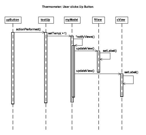 /* * TemperatureView - a view for C or F temps. * Copyright (c) 2001, Bruce E. Wampler */ import java.util.*; import java.awt.*; import javax.swing.*; public class TemperatureView extends WmvcView { private JPanel myPanel; private ThermometerModel myModel; // local copy private char myScale; private static JLabel lblF = new JLabel("Fahrenheit: "); private static JLabel lblC = new JLabel("Celsius: "); private JLabel fldTemp; public JPanel getPanel() { return myPanel; } public TemperatureView(char scale) { myModel = (ThermometerModel)WmvcApp.getModel(); myModel.addView(this); // adds update for mvc myScale = scale; // remember my scale myPanel = new JPanel(); // surrounding Panel myPanel.setPreferredSize( new Dimension(390, 40)); if (scale == 'F' || scale == 'f') { myPanel.add(lblF); // F degrees } else { myPanel.add(lblC); // C degrees } fldTemp = new JLabel(" "); fldTemp.setForeground(Color.black); // temp in black myPanel.add(fldTemp); } public void updateView() { int val = myModel.getTemp(); if (myScale == 'C') val = (int) (((double)(val-32))/1.8); // not rounded fldTemp.setText(Integer.toString(val)); } }UML Sequence Diagram for Thermometer