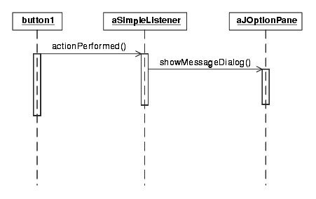 The main method starts by creating the Simple1 object, which then creates the user GUI by defining the JPanel and adding the JButtons. After each button is created, JButton.addActionListener is called for each button instance to add the single instance of SimpleListener. Finally, each button is added to the panel. After the GUI has been created, main adds the panel to the frame, and displays the results. When a user clicks one of the buttons, the actionPerformed callback is called, and inside if statements are used to determine which button was pressed, and an appropriate modal dialog box is displayed. The UML sequence diagram in Figure 5-6 shows the sequence of operations when a user clicks on Button1.