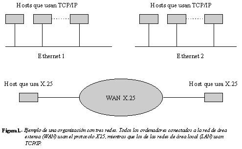 Por ejemplo, la Figura 1 ilustra una organización con dos sedes que utiliza tres redes. Cada sede tiene su propia Ethernet . Una red de área extensa (WAN) que utiliza los protocolos X.25 conecta los host de las dos sedes. La figura muestra un subconjunto de máquinas conectadas a cada red.