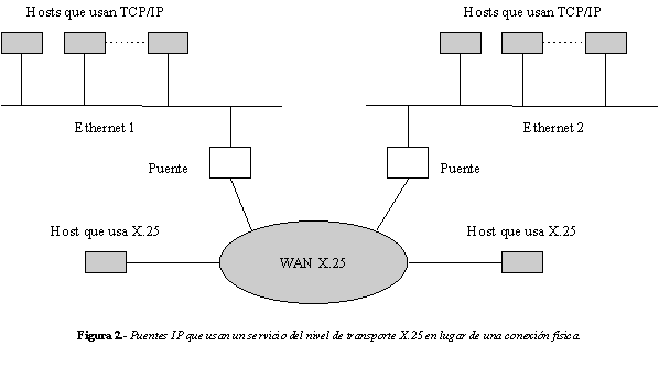 Hay muchas redes que funcionan mediante el uso de los servicios de conexión a nivel de transporte en lugar de conexiones físicas. Por ejemplo, consideremos las redes de la Figura 1 de nuevo. Supongamos que la organización decide interconectar sus dos Ethernet para configurar una sola red TCP/IP que permita a todos los host pertenecientes a cada una de ellas comunicarse con la otra. La estrategia más común a seguir, sería instalar dos puentes entre las Ethernet. Sin embargo, si una gran distancia separa a las dos Ethernet, el coste de introducir una línea alquilada dedicada a interconectar las dos redes puede ser prohibitivo. Este coste adicional puede ser especialmente difícil de justificar teniendo en cuenta que la organización ya dispone de una red X.25 para conectar las dos sedes.