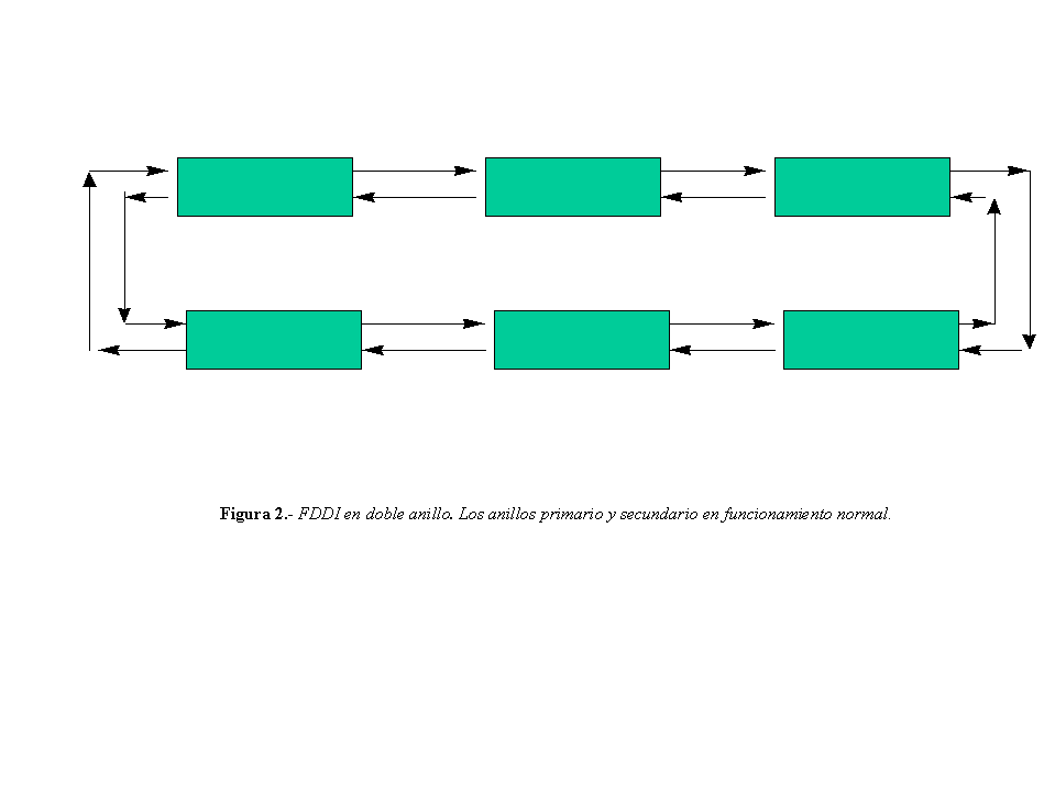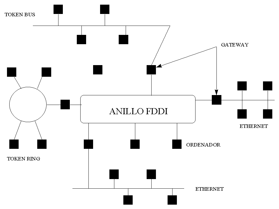FDDI es una Token Ring de alto rendimiento sobre fibra óptica que ejecuta a 100 Mbps sobre distancias de 200 Km. con hasta 1000 estaciones conectadas. Puede ser usada en el mismo sentido que cualquiera de las LAN’s 802, pero debido a su alto ancho de banda, otro uso común es como red troncal para conectar redes locales de cobre, como se muestra en la figura 1.