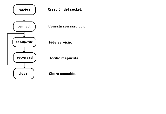 Para que un proceso cliente inicie una conexión con un servidor a través de un socket, es necesario realizar una llamada a connect. Así, se crea un circuito virtual entre los dos procesos cuyos extremos son los sockets. La secuencia de primitivas para la utilización de sockets que el servidor tiene que usar, se muestra a continuación.