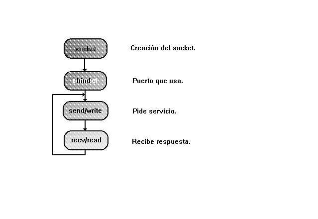 Secuencia de llamadas hecha por un cliente.Pero en el caso de una comunicación sin conexión, el cliente no utiliza la llamada connect para establecer un circuito virtual entre él y el servidor, sino que lo único que hace es conectarse a un puerto por el cual envía peticiones de servicio a un servidor. La secuencia de llamadas: