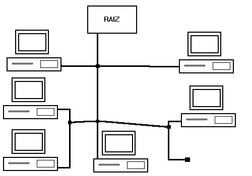 En este tipo de LAN todos los terminales están conectados a un ordenador central, que es el que se encarga de manejar los mensajes que van de un terminal a otro, la prioridad, ... , o sea, el que se encarga de gestionar la red. El principal inconveniente es que si cae el ordenador central, cae la red. Si un terminal quiere comunicarse, enviarle un mensaje, ... a otro terminal, lo debe hacer por el ordenador central.