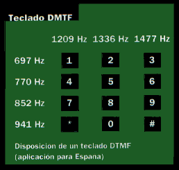 La marcación de tonos multifrecuencia DTMF (Dual Tone Multifrecuency) consiste en un sistema de marcación basado en la transmisión de un tono de alta frecuencia y otro de baja frecuencia que combinados identifican los dígitos del teclado de un terminal telefónico (0 a 9 y teclas especiales, # *).