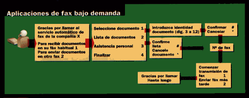 Las aplicaciones de fax bajo demanda, permiten a los usuarios llamantes la selección y recepción d documentos de manera instantánea en una máquina de fax, usando un teléfono de marcación multifrecuencia. Este servicio proporciona en conjunto una alta flexibilidad al llamante para seleccionar e imprimir documentos en el modo que más le convenga, disponiendo siempre de la posibilidad de asistencia personal de un agente.