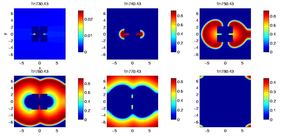 Nuestro grupo de investigación estudia la propagación de ondas espirales en reacciones químicas auto-catalizadas de tipo Belousov-Zhabotinskii con el modelo Oregonator (BZO). No centramos en los efectos de diferentes forzamientos con énfasis en la interacción, destrucción y ruptura de las espirales. En las figuras 3, 4 y 5 se presentan algunos resultados.
